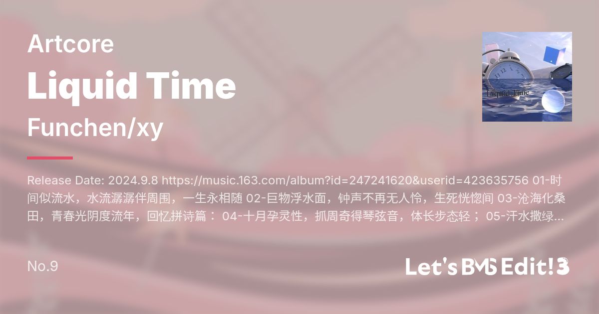 Artist: Funchen/xy Genre: Artcore / Release Date: 2024.9.8 https://music.163.com/album?id=247241620&userid=423635756 01-时间似流水,水流潺潺伴周围,一生永相随 02-巨物浮水面,钟声不再无人怜,生死恍惚间 03-沧海化桑田,青春光阴度流年,回忆拼诗篇: 04-十月孕灵性,...