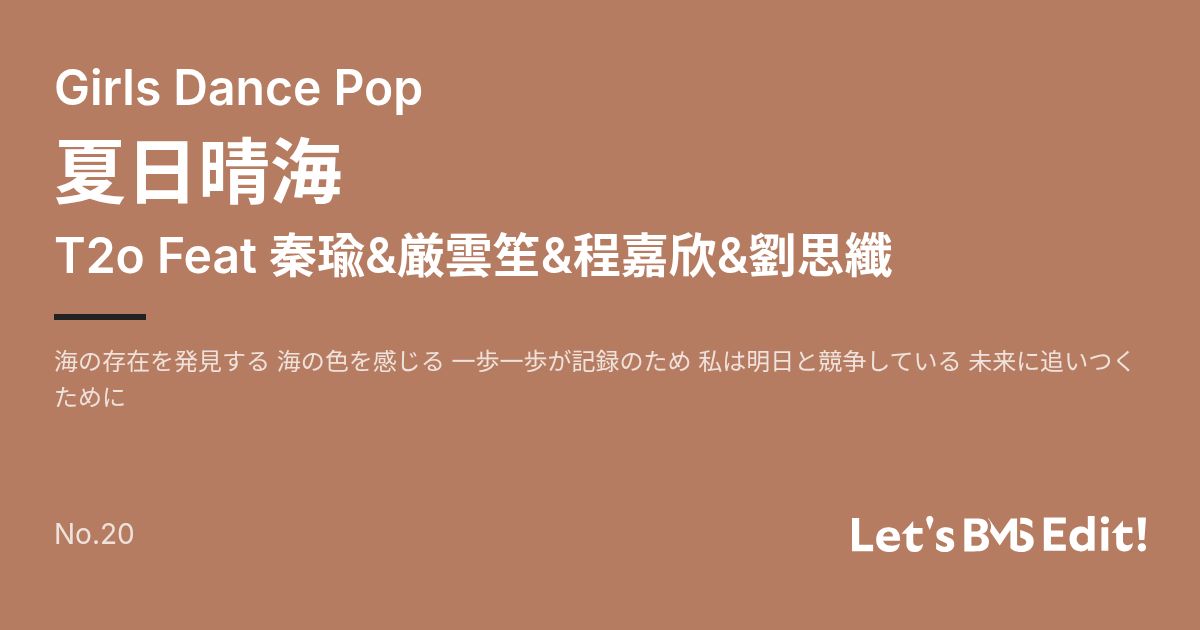Artist: T2o Feat 秦瑜&厳雲笙&程嘉欣&劉思纖 Genre: Girls Dance Pop / 海の存在を発見する 海の色を感じる 一歩一歩が記録のため 私は明日と競争している 未来に追いつくために