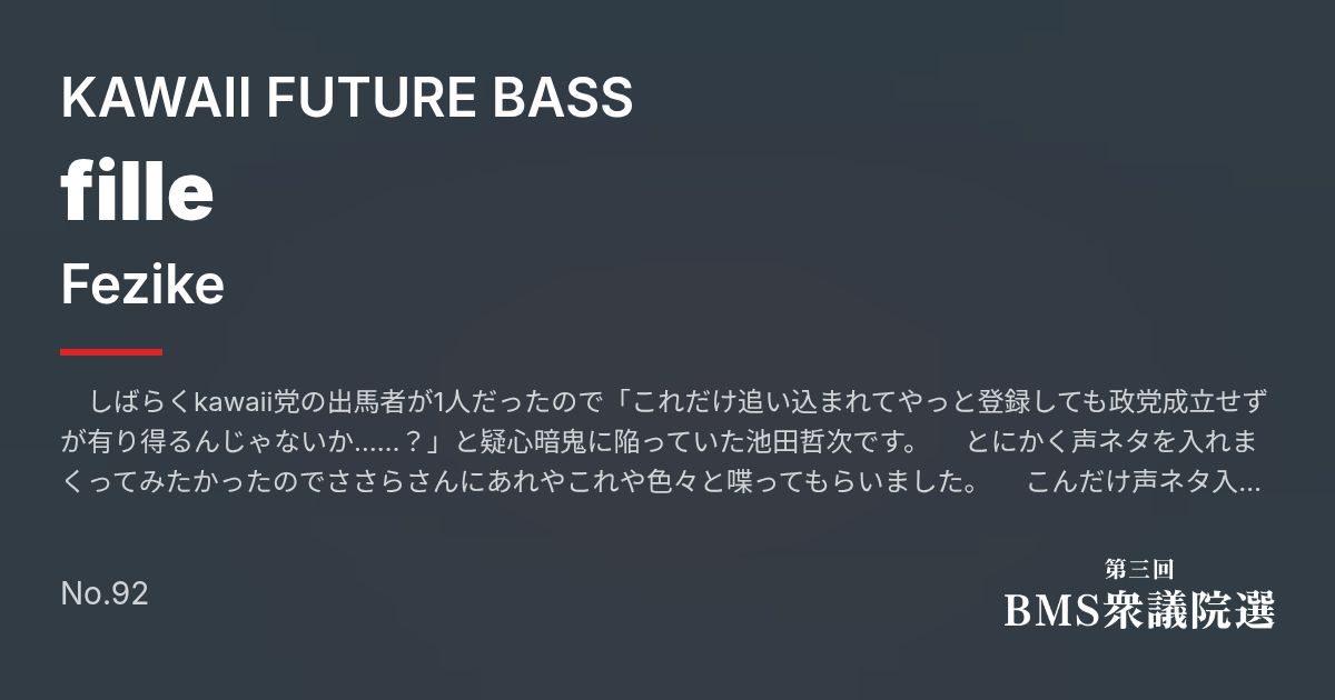 Artist: Fezike Genre: KAWAII FUTURE BASS / しばらくkawaii党の出馬者が1人だったので「これだけ追い込まれてやっと登録しても政党成立せずが有り得るんじゃないか……?」と疑心暗鬼に陥っていた池田哲次です。 とにかく声ネタを入れまくってみたかったのでささらさんにあれやこれや色々と喋ってもらいました。 こんだけ声ネタ入れまくったんだから皿パーティー不可...