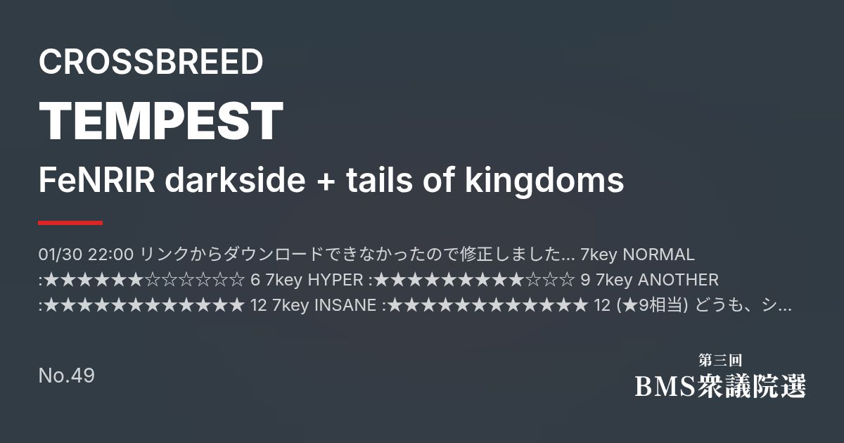Artist: FeNRIR darkside + tails of kingdoms Genre: CROSSBREED / 01/30 22:00 リンクからダウンロードできなかったので修正しました… 7key NORMAL :★★★★★★☆☆☆☆☆☆ 6 7key HYPER :★★★★★★★★★☆☆☆ 9 7key ANOTHER :★★★★★★★★★★★★ 12 7key INS...