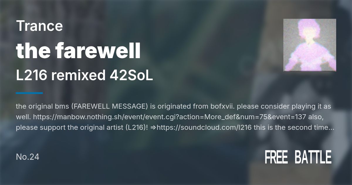 Artist: L216 remixed 42SoL Genre: Trance / the original bms (FAREWELL MESSAGE) is originated from bofxvii. please consider playing it as well. https://manbow.nothing.sh/event/event.cgi?action=More_def...