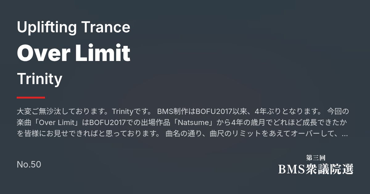 Artist: Trinity Genre: Uplifting Trance / 大変ご無沙汰しております。Trinityです。 BMS制作はBOFU2017以来、4年ぶりとなります。 今回の楽曲「Over Limit」はBOFU2017での出場作品「Natsume」から4年の歳月でどれほど成長できたかを皆様にお見せできればと思っております。 曲名の通り、曲尺のリミットをあえてオーバーして、T...
