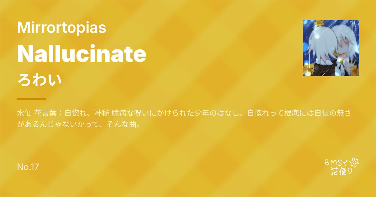 Artist: ろわい Genre: Mirrortopias / 水仙 花言葉:自惚れ、神秘 臆病な呪いにかけられた少年のはなし。自惚れって根底には自信の無さがあるんじゃないかって、そんな曲。