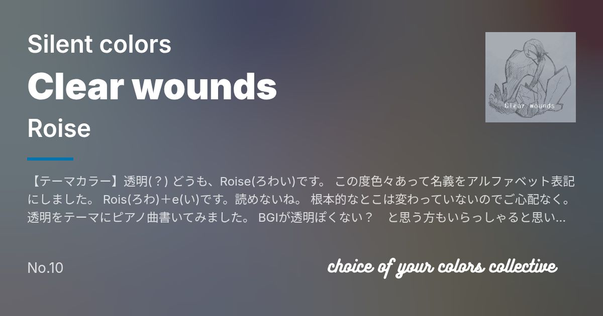 Artist: Roise Genre: Silent colors / 【テーマカラー】透明(?) どうも、Roise(ろわい)です。 この度色々あって名義をアルファベット表記にしました。 Rois(ろわ)+e(い)です。読めないね。 根本的なとこは変わっていないのでご心配なく。 透明をテーマにピアノ曲書いてみました。 BGIが透明ぽくない? と思う方もいらっしゃると思いますが 実はBGI...
