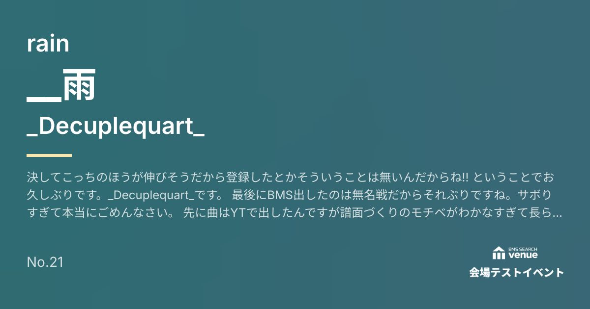 Artist: _Decuplequart_ Genre: rain / 決してこっちのほうが伸びそうだから登録したとかそういうことは無いんだからね!! ということでお久しぶりです。_Decuplequart_です。 最後にBMS出したのは無名戦だからそれぶりですね。サボりすぎて本当にごめんなさい。 先に曲はYTで出したんですが譜面づくりのモチベがわかなすぎて長らくおまたせした状況となってしまいま...
