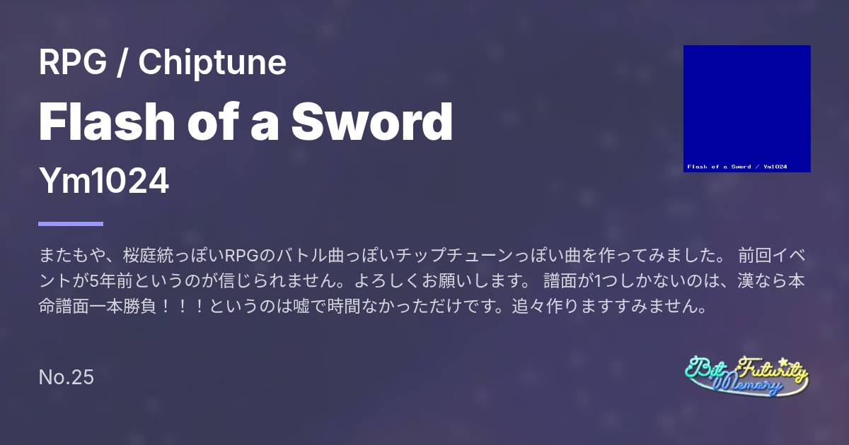Artist: Ym1024 Genre: RPG / Chiptune / またもや、桜庭統っぽいRPGのバトル曲っぽいチップチューンっぽい曲を作ってみました。 前回イベントが5年前というのが信じられません。よろしくお願いします。 譜面が1つしかないのは、漢なら本命譜面一本勝負!!!というのは嘘で時間なかっただけです。追々作りますすみません。
