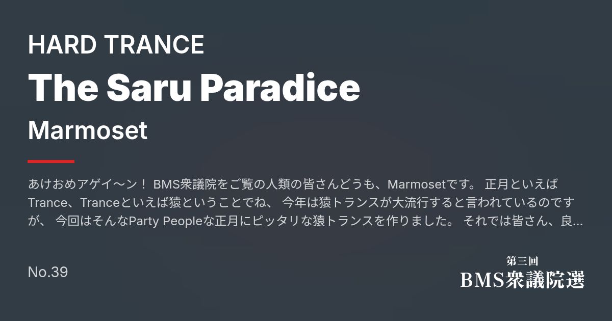 Artist: Marmoset Genre: HARD TRANCE / あけおめアゲイ~ン! BMS衆議院をご覧の人類の皆さんどうも、Marmosetです。 正月といえばTrance、Tranceといえば猿ということでね、 今年は猿トランスが大流行すると言われているのですが、 今回はそんなParty Peopleな正月にピッタリな猿トランスを作りました。 それでは皆さん、良いお年を! M...
