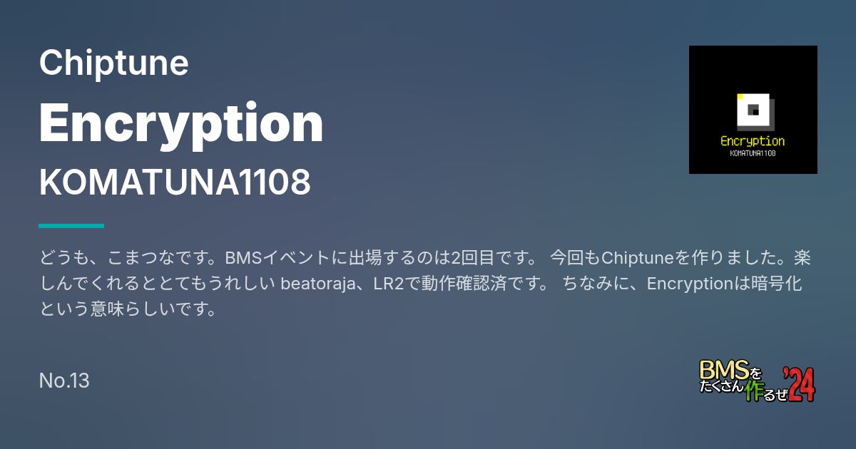 Artist: KOMATUNA1108 Genre: Chiptune / どうも、こまつなです。BMSイベントに出場するのは2回目です。 今回もChiptuneを作りました。楽しんでくれるととてもうれしい beatoraja、LR2で動作確認済です。 ちなみに、Encryptionは暗号化という意味らしいです。
