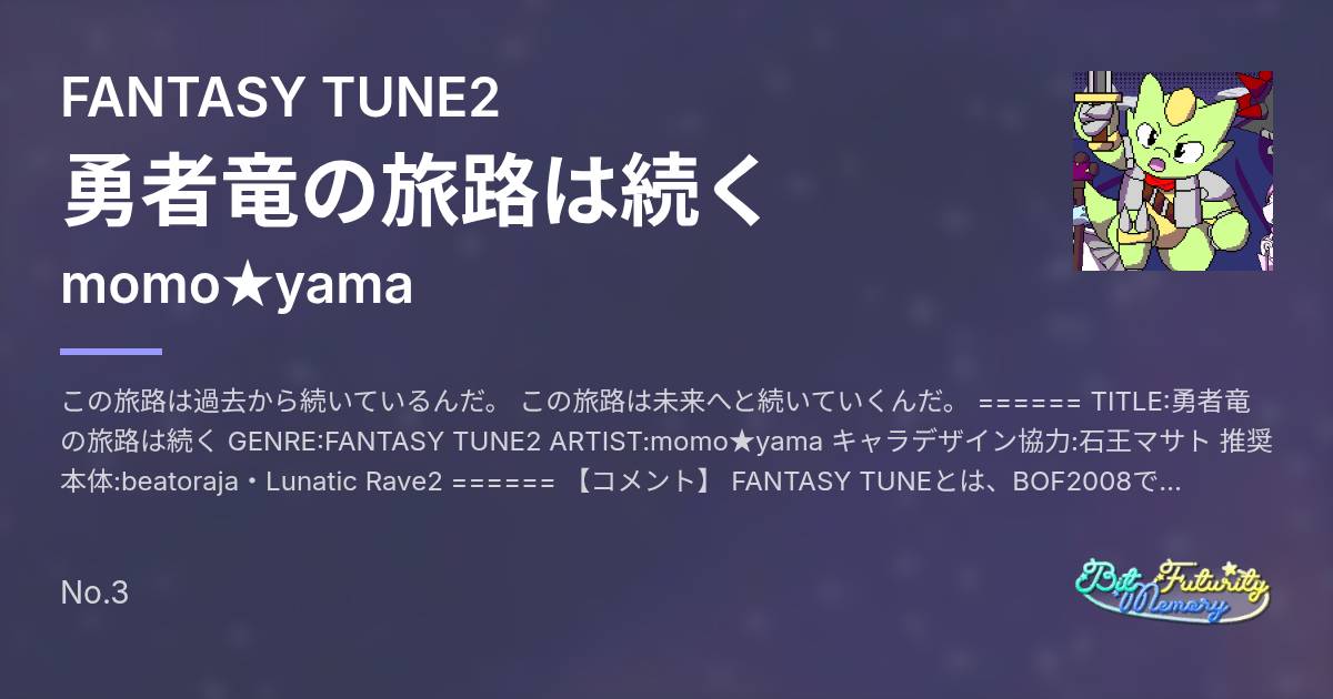 Artist: momo★yama Genre: FANTASY TUNE2 / この旅路は過去から続いているんだ。 この旅路は未来へと続いていくんだ。 ====== TITLE:勇者竜の旅路は続く GENRE:FANTASY TUNE2 ARTIST:momo★yama キャラデザイン協力:石王マサト 推奨本体:beatoraja・Lunatic Rave2 ====== 【コメント】 ...