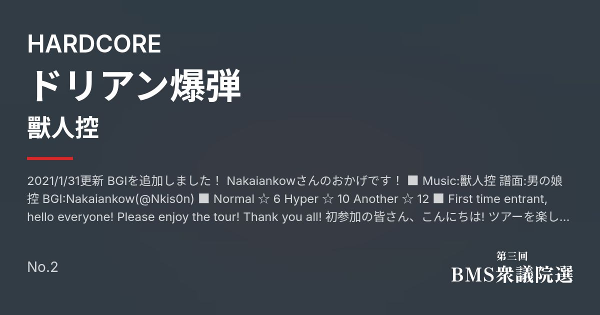 Artist: 獸人控 Genre: HARDCORE / 2021/1/31更新 BGIを追加しました! Nakaiankowさんのおかげです! ■ Music:獸人控 譜面:男の娘控 BGI:Nakaiankow(@Nkis0n) ■ Normal ☆ 6 Hyper ☆ 10 Another ☆ 12 ■ First time entrant, hello everyo...