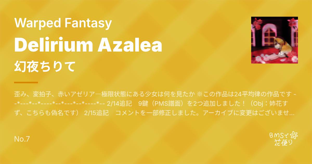 Artist: 幻夜ちりて Genre: Warped Fantasy / 歪み、変拍子、赤いアゼリア―極限状態にある少女は何を見たか ※この作品は24平均律の作品です --*---*--*----*--*---*--*----*-- 2/14追記 9鍵(PMS譜面)を2つ追加しました!(Obj:姉花すず、こちらも偽名です) 2/15追記 コメントを一部修正しました。アーカイブに変更はございま...