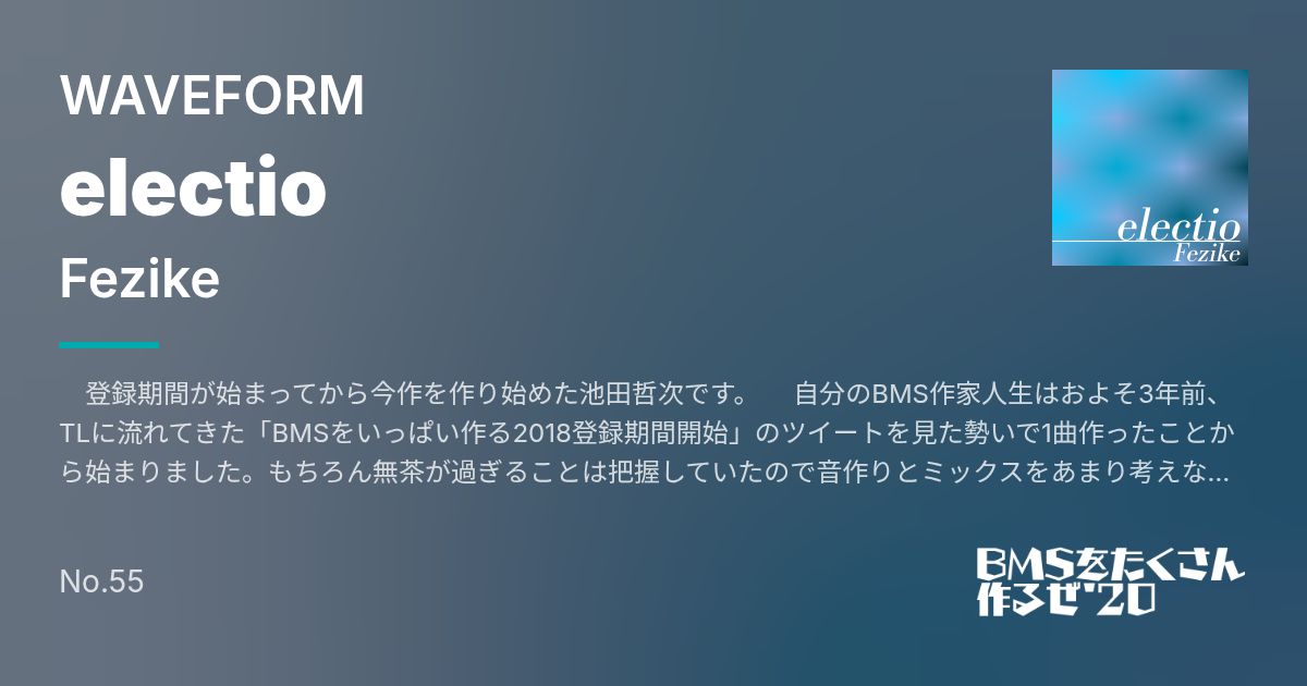 Artist: Fezike Genre: WAVEFORM / 登録期間が始まってから今作を作り始めた池田哲次です。 自分のBMS作家人生はおよそ3年前、TLに流れてきた「BMSをいっぱい作る2018登録期間開始」のツイートを見た勢いで1曲作ったことから始まりました。もちろん無茶が過ぎることは把握していたので音作りとミックスをあまり考えなくていいファミコン発音数準拠のCHIPTUNEを作りま...