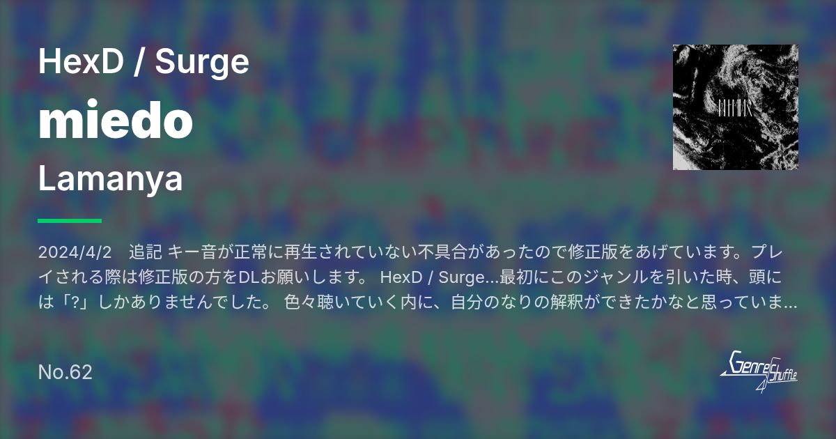 Artist: Lamanya Genre: HexD / Surge / 2024/4/2 追記 キー音が正常に再生されていない不具合があったので修正版をあげています。プレイされる際は修正版の方をDLお願いします。 HexD / Surge...最初にこのジャンルを引いた時、頭には「?」しかありませんでした。 色々聴いていく内に、自分のなりの解釈ができたかなと思っています。 ちょっとホラーなテ...