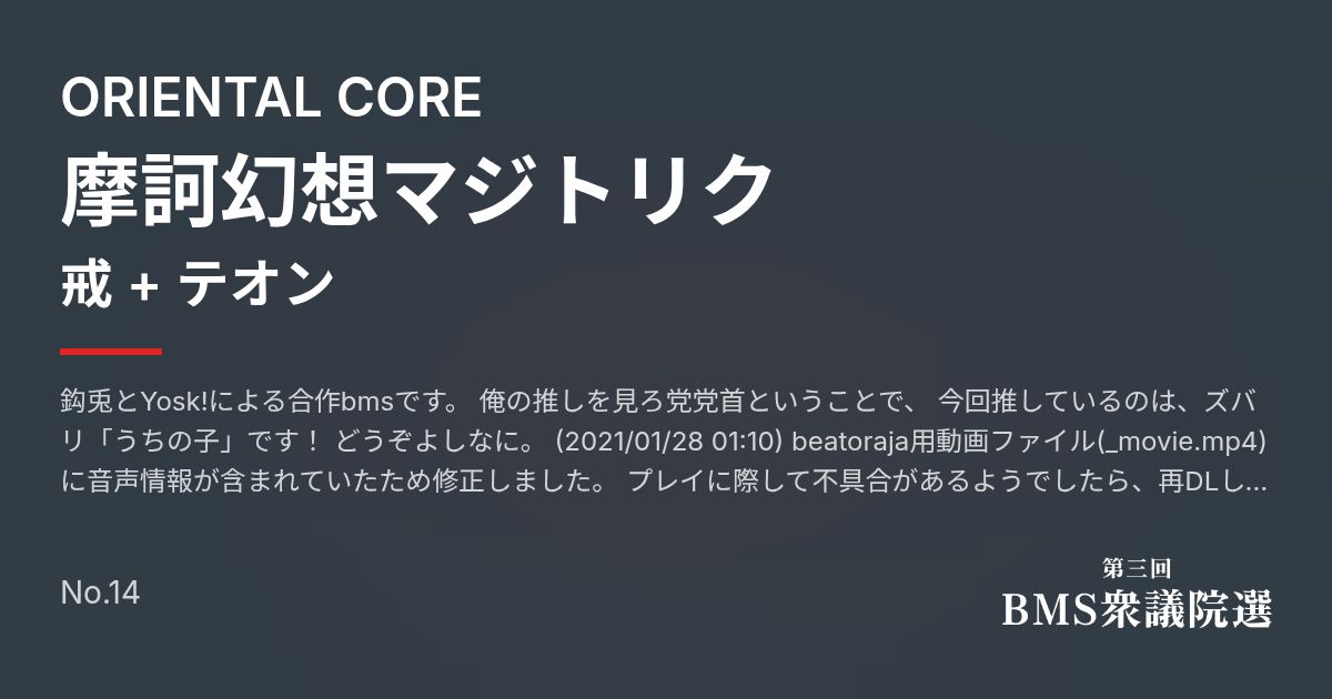 【第三回BMS衆議院選】摩訶幻想マジトリク / 戒 + テオン Genre : ORIENTAL CORETitle : 摩訶幻想マジトリクArtist : 戒 + テオン(鈎兎(KagiUsagi), Yosk!)Ev...