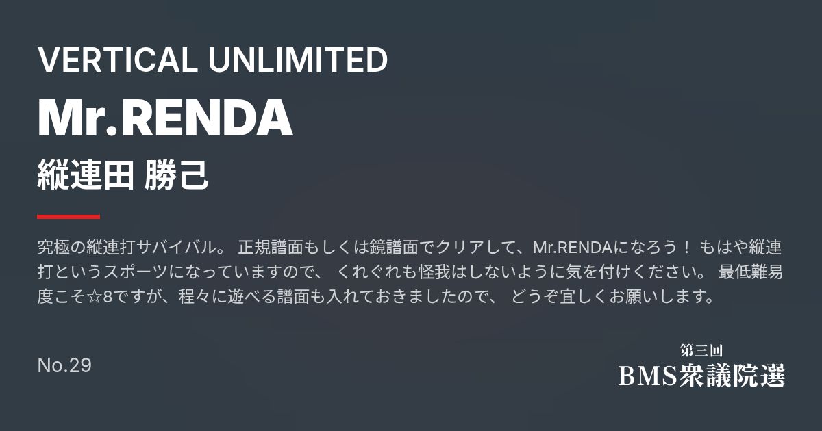 Artist: 縦連田 勝己 Genre: VERTICAL UNLIMITED / 究極の縦連打サバイバル。 正規譜面もしくは鏡譜面でクリアして、Mr.RENDAになろう! もはや縦連打というスポーツになっていますので、 くれぐれも怪我はしないように気を付けください。 最低難易度こそ☆8ですが、程々に遊べる譜面も入れておきましたので、 どうぞ宜しくお願いします。
