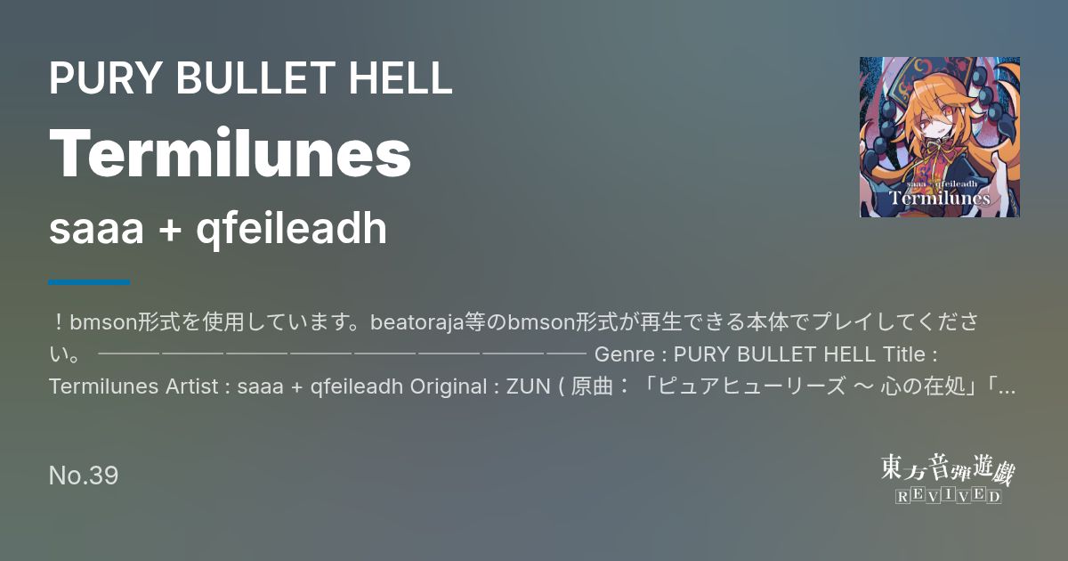 Artist: saaa + qfeileadh Genre: PURY BULLET HELL / !bmson形式を使用しています。beatoraja等のbmson形式が再生できる本体でプレイしてください。 ――――――――――――――――――――――― Genre : PURY BULLET HELL Title : Termilunes Artist : saaa + qfeilea...