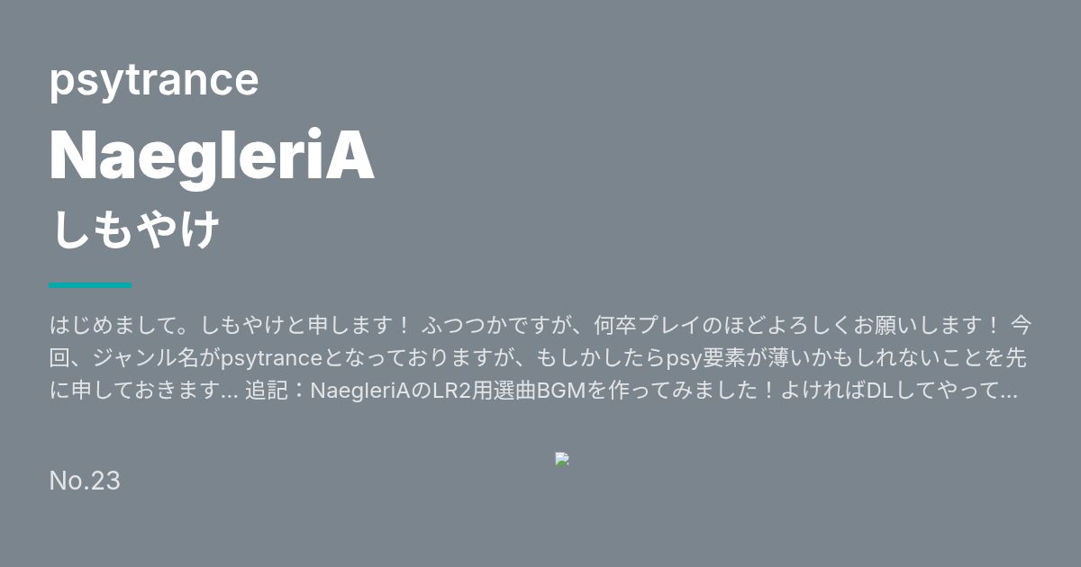 Artist: しもやけ Genre: psytrance / はじめまして。しもやけと申します! ふつつかですが、何卒プレイのほどよろしくお願いします! 今回、ジャンル名がpsytranceとなっておりますが、もしかしたらpsy要素が薄いかもしれないことを先に申しておきます… 追記:NaegleriAのLR2用選曲BGMを作ってみました!よければDLしてやってください! https://dl....