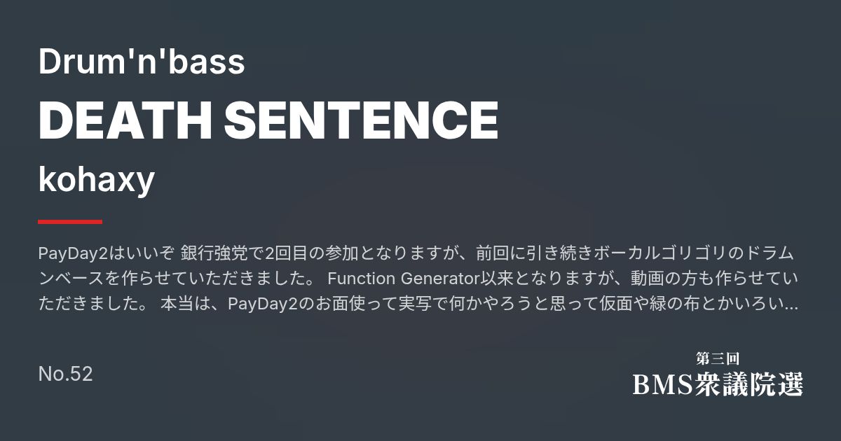 Artist: kohaxy Genre: Drum'n'bass / PayDay2はいいぞ 銀行強党で2回目の参加となりますが、前回に引き続きボーカルゴリゴリのドラムンベースを作らせていただきました。 Function Generator以来となりますが、動画の方も作らせていただきました。 本当は、PayDay2のお面使って実写で何かやろうと思って仮面や緑の布とかいろいろ買ったのですが...