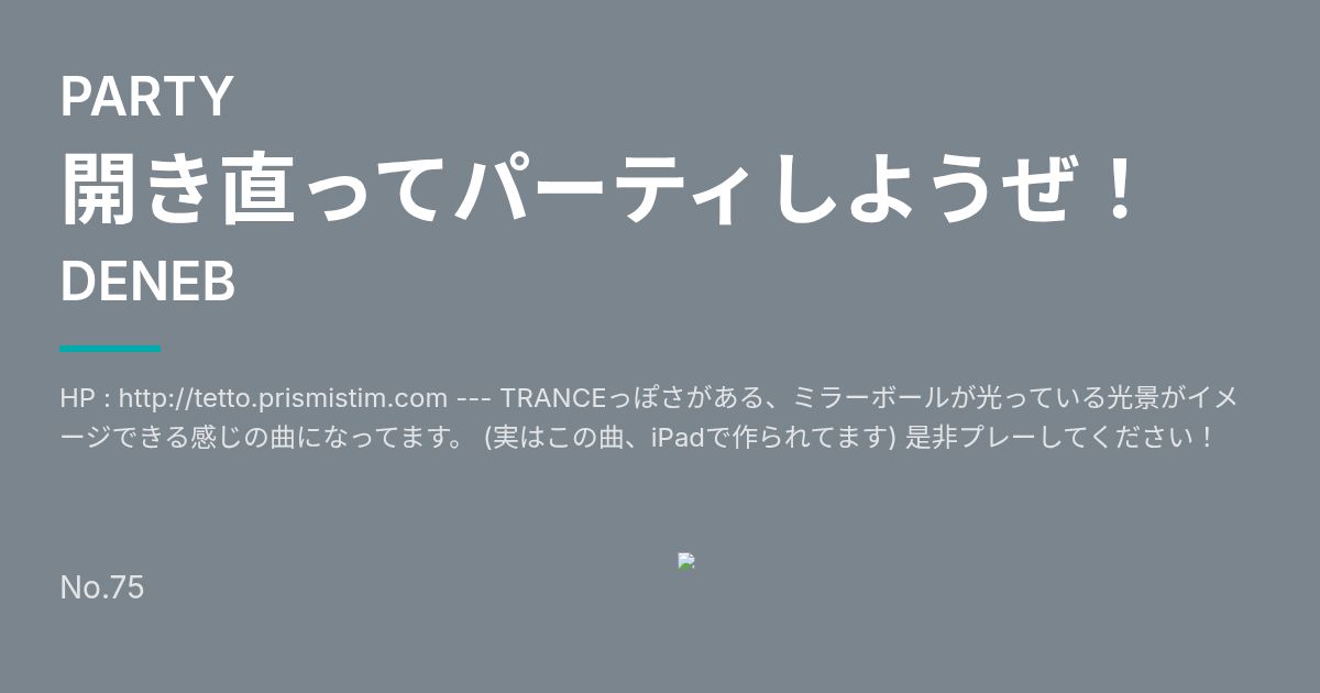 Artist: DENEB Genre: PARTY / HP : http://tetto.prismistim.com --- TRANCEっぽさがある、ミラーボールが光っている光景がイメージできる感じの曲になってます。 (実はこの曲、iPadで作られてます) 是非プレーしてください!