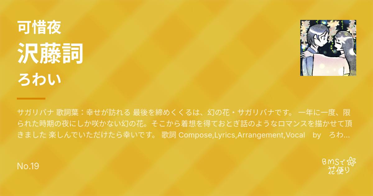 Artist: ろわい Genre: 可惜夜 / サガリバナ 歌詞葉:幸せが訪れる 最後を締めくくるは、幻の花・サガリバナです。 一年に一度、限られた時期の夜にしか咲かない幻の花。そこから着想を得ておとぎ話のようなロマンスを描かせて頂きました 楽しんでいただけたら幸いです。 歌詞 Compose,Lyrics,Arrangement,Vocal by ろわい 開くつぼみが香る 今亡き...