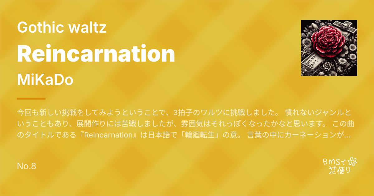 Artist: MiKaDo Genre: Gothic waltz / 今回も新しい挑戦をしてみようということで、3拍子のワルツに挑戦しました。 慣れないジャンルということもあり、展開作りには苦戦しましたが、雰囲気はそれっぽくなったかなと思います。 この曲のタイトルである『Reincarnation』は日本語で「輪廻転生」の意。 言葉の中にカーネーションが含まれていることと、お墓にカーネーシ...