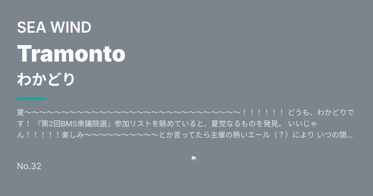Artist: わかどり Genre: SEA WIND / 夏~~~~~~~~~~~~~~~~~~~~~~~~~~~~~!!!!!! どうも、わかどりです! 『第2回BMS衆議院選』参加リストを眺めていると、夏党なるものを発見。 いいじゃん!!!!!楽しみ~~~~~~~~~~とか言ってたら主催の熱いエール(?)により いつの間にか作る側になってました!感謝!! 以前作った夏ソングを元に、流...