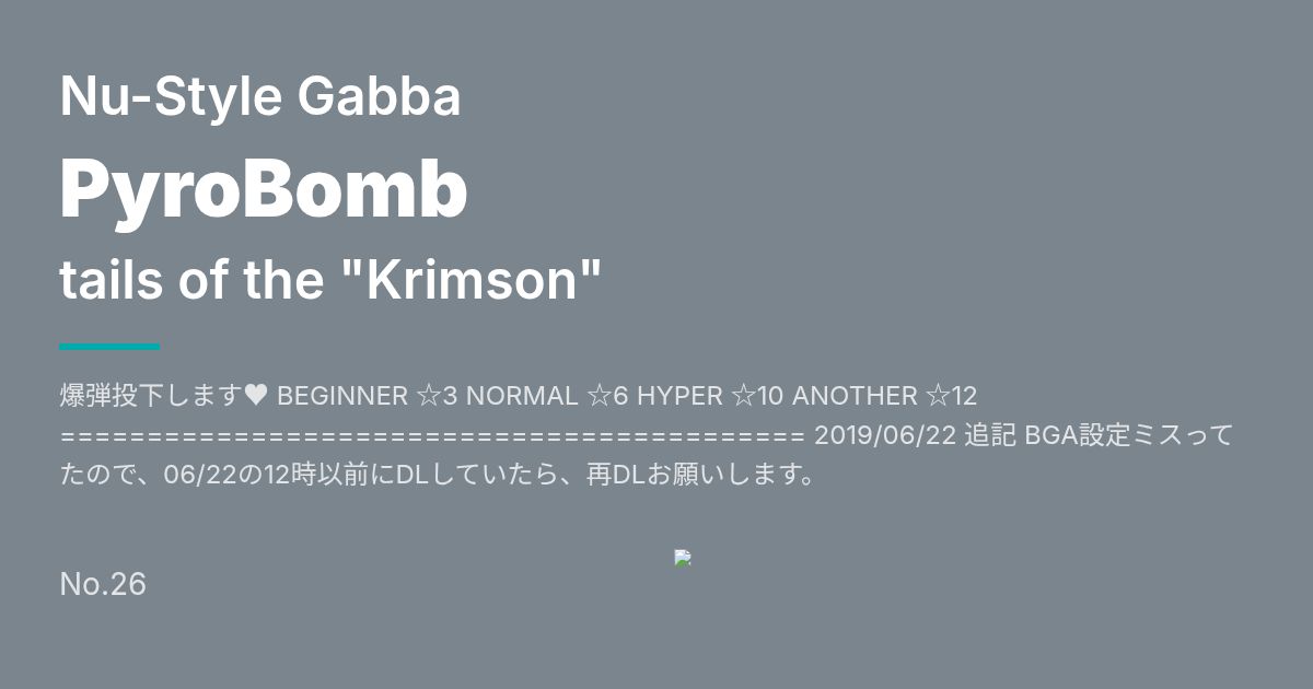 Artist: tails of the "Krimson" Genre: Nu-Style Gabba / 爆弾投下します♥ BEGINNER ☆3 NORMAL ☆6 HYPER ☆10 ANOTHER ☆12 =========================================== 2019/06/22 追記 BGA設定ミスってたので、06/22の12時以前にDLしていたら...