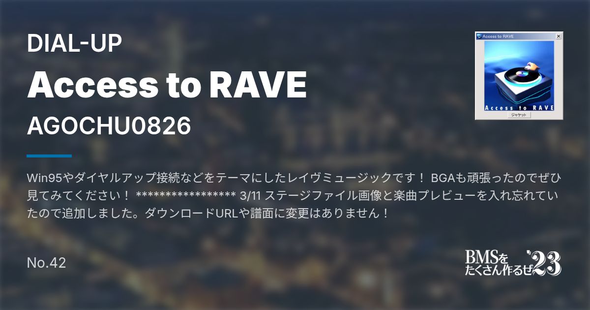 Artist: AGOCHU0826 Genre: DIAL-UP / Win95やダイヤルアップ接続などをテーマにしたレイヴミュージックです! BGAも頑張ったのでぜひ見てみてください! ***************** 3/11 ステージファイル画像と楽曲プレビューを入れ忘れていたので追加しました。ダウンロードURLや譜面に変更はありません!