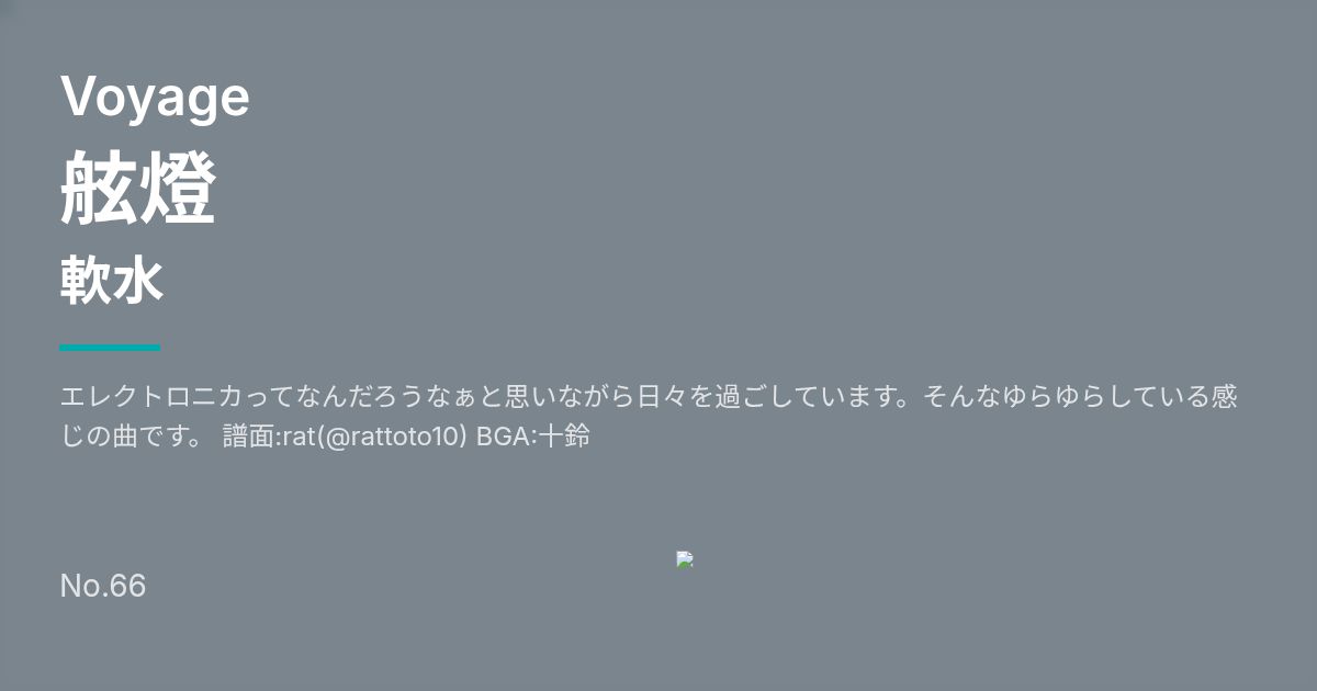 Artist: 軟水 Genre: Voyage / エレクトロニカってなんだろうなぁと思いながら日々を過ごしています。そんなゆらゆらしている感じの曲です。 譜面:rat(@rattoto10) BGA:十鈴