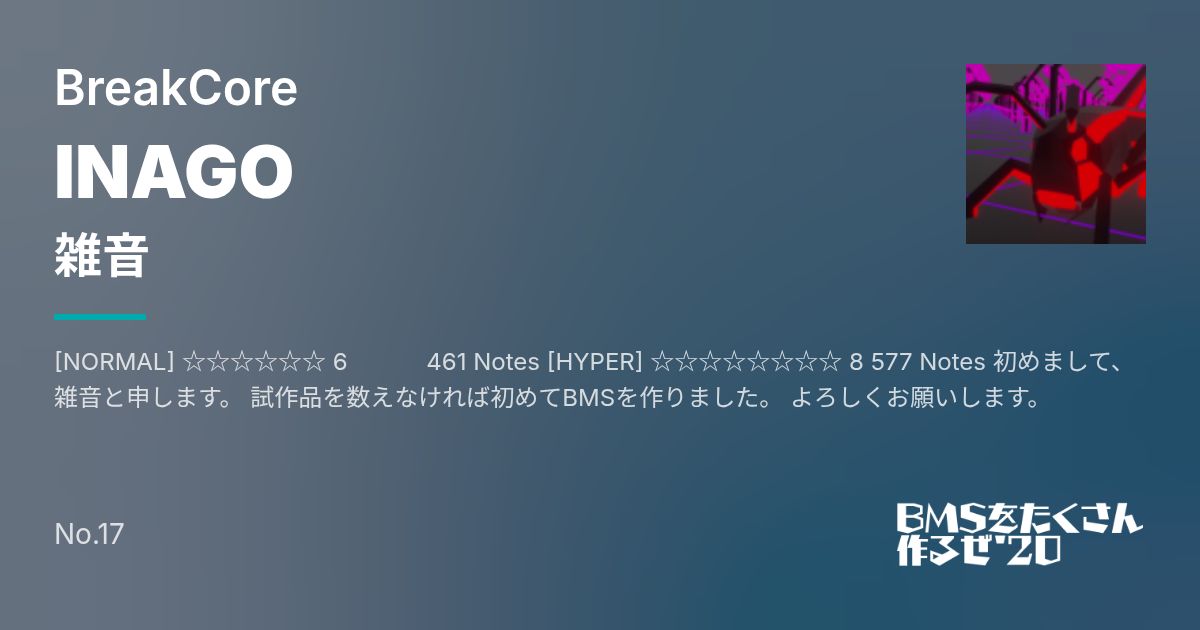 Artist: 雑音 Genre: BreakCore / [NORMAL] ☆☆☆☆☆☆ 6 461 Notes [HYPER] ☆☆☆☆☆☆☆☆ 8 577 Notes 初めまして、雑音と申します。 試作品を数えなければ初めてBMSを作りました。 よろしくお願いします。
