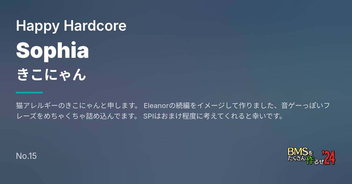 Artist: きこにゃん Genre: Happy Hardcore / 猫アレルギーのきこにゃんと申します。 Eleanorの続編をイメージして作りました、音ゲーっぽいフレーズをめちゃくちゃ詰め込んでます。 SPIはおまけ程度に考えてくれると幸いです。