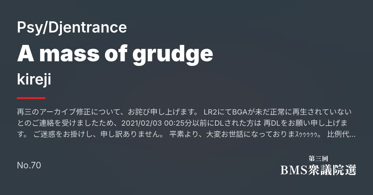 Artist: kireji Genre: Psy/Djentrance / 再三のアーカイブ修正について、お詫び申し上げます。 LR2にてBGAが未だ正常に再生されていないとのご連絡を受けましたため、2021/02/03 00:25分以前にDLされた方は 再DLをお願い申し上げます。 ご迷惑をお掛けし、申し訳ありません。 平素より、大変お世話になっておりまスゥゥゥゥゥ。 比例代表にはDjen...