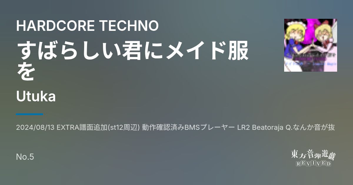 Artist: Utuka Genre: HARDCORE TECHNO / 2024/08/13 EXTRA譜面追加(st12周辺) 動作確認済みBMSプレーヤー LR2 Beatoraja Q.なんか音が抜ける(beatoraja) A.同時発音数がかなり多い曲になっているので Audio>同時発音数を256以上に設定すると改善される可能性があります。 Title : すばらしい君にメイ...