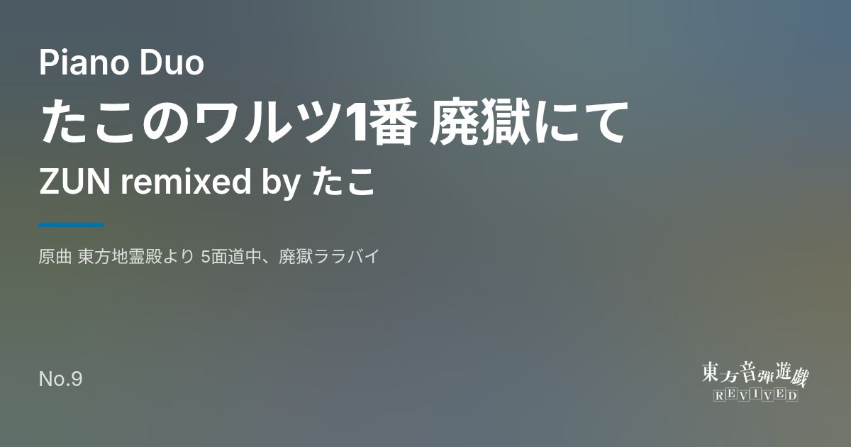 Artist: ZUN remixed by たこ Genre: Piano Duo / 原曲 東方地霊殿より 5面道中、廃獄ララバイ