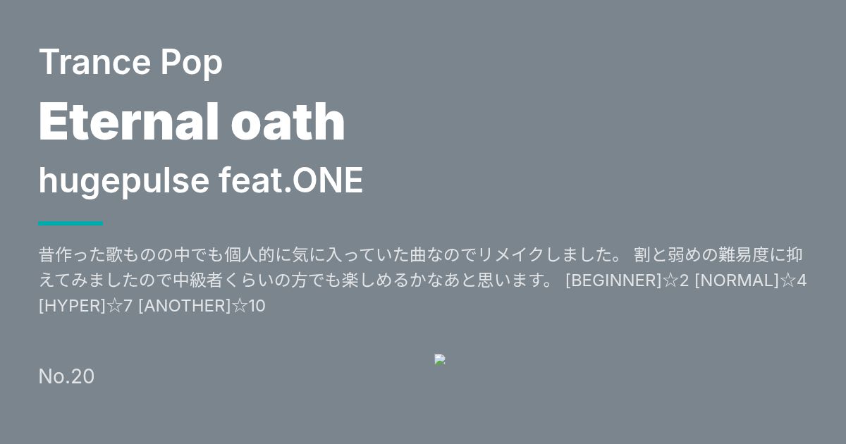 Artist: hugepulse feat.ONE Genre: Trance Pop / 昔作った歌ものの中でも個人的に気に入っていた曲なのでリメイクしました。 割と弱めの難易度に抑えてみましたので中級者くらいの方でも楽しめるかなあと思います。 [BEGINNER]☆2 [NORMAL]☆4 [HYPER]☆7 [ANOTHER]☆10