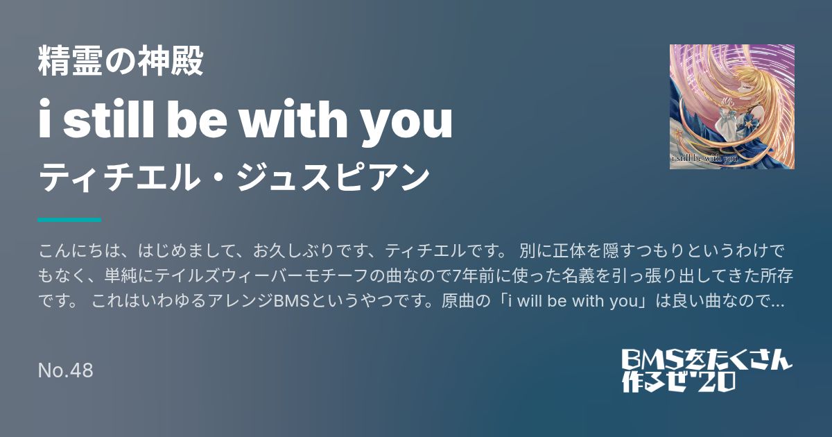 Artist: ティチエル・ジュスピアン Genre: 精霊の神殿 / こんにちは、はじめまして、お久しぶりです、ティチエルです。 別に正体を隠すつもりというわけでもなく、単純にテイルズウィーバーモチーフの曲なので7年前に使った名義を引っ張り出してきた所存です。 これはいわゆるアレンジBMSというやつです。原曲の「i will be with you」は良い曲なので、そっちも聞くといいです。