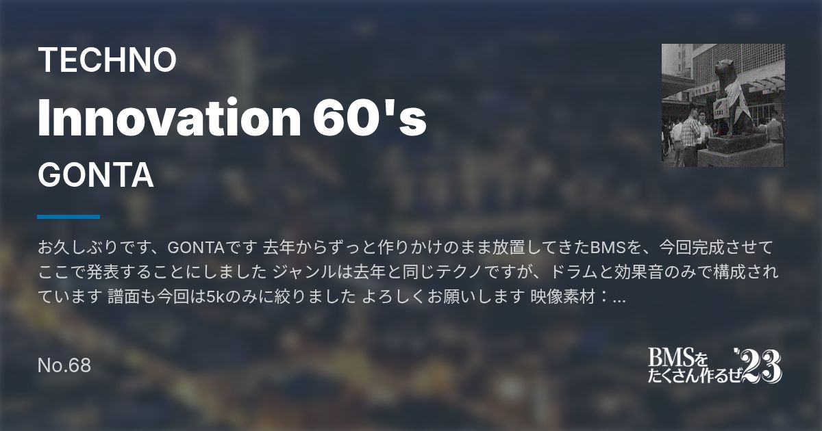 Artist: GONTA Genre: TECHNO / お久しぶりです、GONTAです 去年からずっと作りかけのまま放置してきたBMSを、今回完成させてここで発表することにしました ジャンルは去年と同じテクノですが、ドラムと効果音のみで構成されています 譜面も今回は5kのみに絞りました よろしくお願いします 映像素材:https://www.nhk.or.jp/archives/cre...