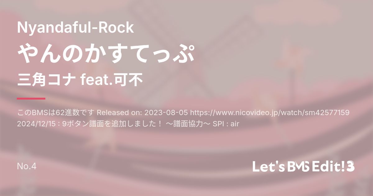 Artist: 三角コナ feat.可不 Genre: Nyandaful-Rock / このBMSは62進数です Released on: 2023-08-05 https://www.nicovideo.jp/watch/sm42577159 2024/12/15 : 9ボタン譜面を追加しました! 〜譜面協力〜 SPI : air