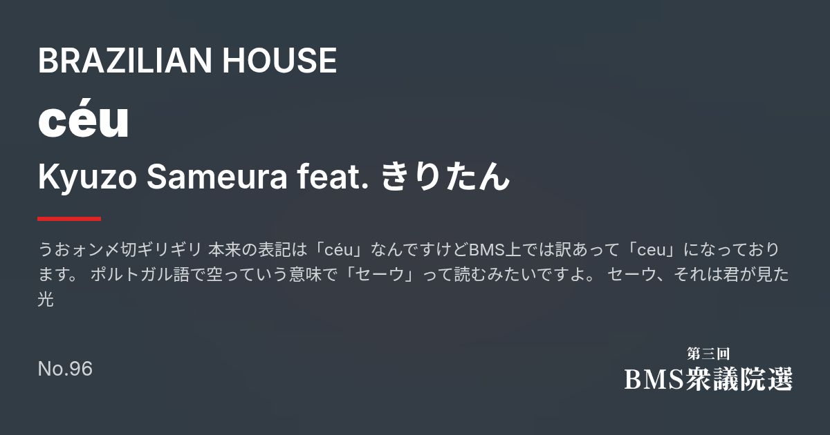 Artist: Kyuzo Sameura feat. きりたん Genre: BRAZILIAN HOUSE / うおォン〆切ギリギリ 本来の表記は「céu」なんですけどBMS上では訳あって「ceu」になっております。 ポルトガル語で空っていう意味で「セーウ」って読むみたいですよ。 セーウ、それは君が見た光