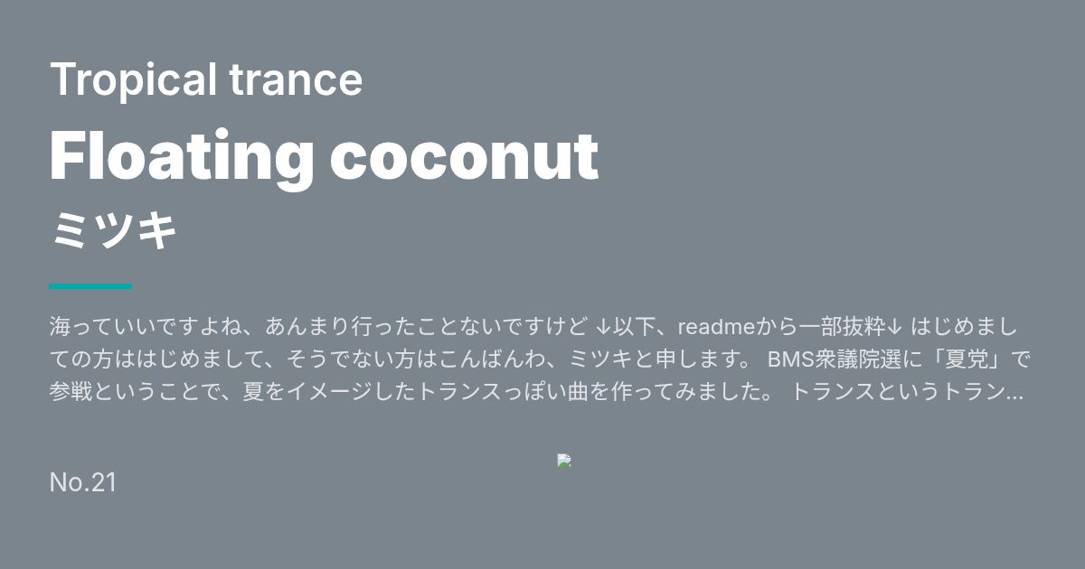 Artist: ミツキ Genre: Tropical trance / 海っていいですよね、あんまり行ったことないですけど ↓以下、readmeから一部抜粋↓ はじめましての方ははじめまして、そうでない方はこんばんわ、ミツキと申します。 BMS衆議院選に「夏党」で参戦ということで、夏をイメージしたトランスっぽい曲を作ってみました。 トランスというトランスを作ったことがない人のトランスなので、クオ...