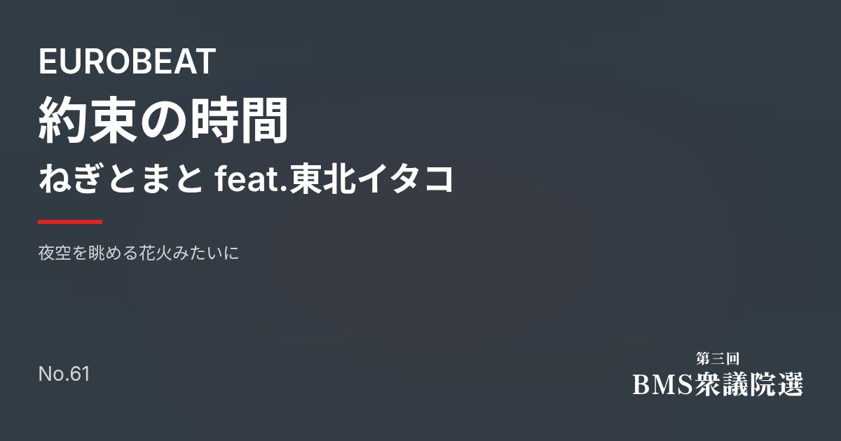 第三回BMS衆議院選参加作品 https://venue.bmssearch.net/bmsshuin3/61 Team:ユーロビー党 Title:約束の時間 Genre:EUROBEAT Music:ねぎとまと (twitter.com/ng_tmt)