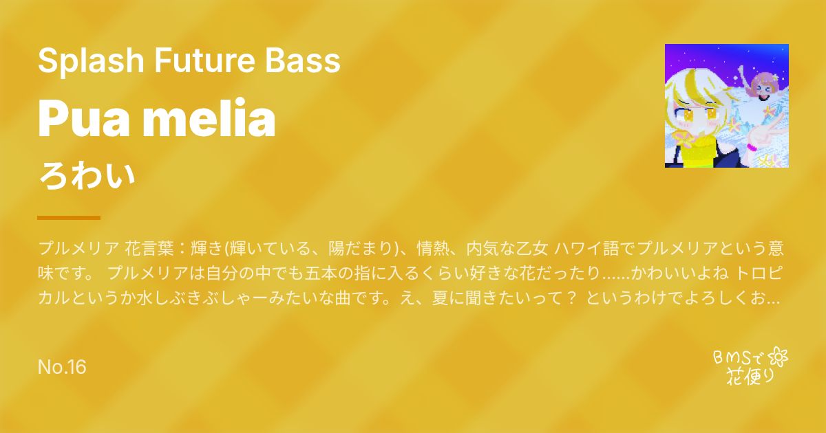 Artist: ろわい Genre: Splash Future Bass / プルメリア 花言葉:輝き(輝いている、陽だまり)、情熱、内気な乙女 ハワイ語でプルメリアという意味です。 プルメリアは自分の中でも五本の指に入るくらい好きな花だったり……かわいいよね トロピカルというか水しぶきぶしゃーみたいな曲です。え、夏に聞きたいって? というわけでよろしくお願いいたします。