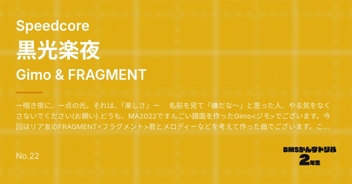 Artist: Gimo & FRAGMENT Genre: Speedcore / ー暗き夜に、一点の光。それは、「楽しさ」ー 名前を見て「嫌だな~」と思った人、やる気をなくさないでください(お願い) どうも、MA2022ですんごい譜面を作ったGimo<ジモ>でございます。今回はリア友のFRAGMENT<フラグメント>君とメロディーなどを考えて作った曲でございます。こちらの曲はBPM"290...