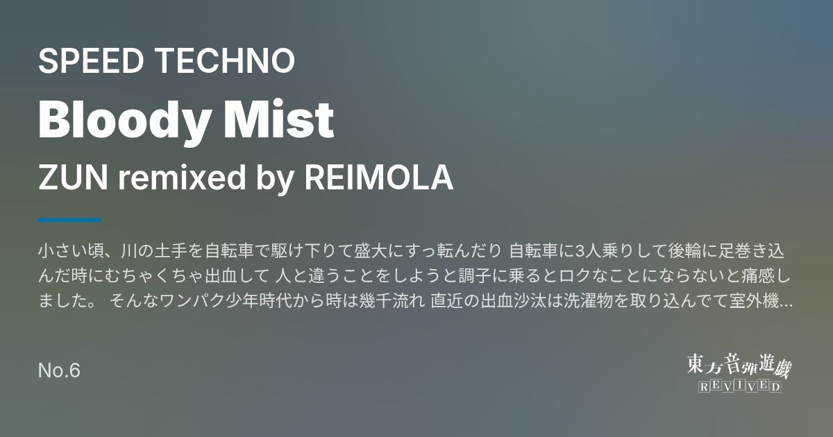 Artist: ZUN remixed by REIMOLA Genre: SPEED TECHNO / 小さい頃、川の土手を自転車で駆け下りて盛大にすっ転んだり 自転車に3人乗りして後輪に足巻き込んだ時にむちゃくちゃ出血して 人と違うことをしようと調子に乗るとロクなことにならないと痛感しました。 そんなワンパク少年時代から時は幾千流れ 直近の出血沙汰は洗濯物を取り込んでて室外機の角に頭ぶつけた時...