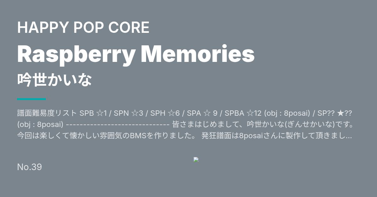 Artist: 吟世かいな Genre: HAPPY POP CORE / 譜面難易度リスト SPB ☆1 / SPN ☆3 / SPH ☆6 / SPA ☆ 9 / SPBA ☆12 (obj : 8posai) / SP?? ★?? (obj : 8posai) ------------------------------ 皆さまはじめまして、吟世かいな(ぎんせかいな)です。 今回は楽しくて懐...