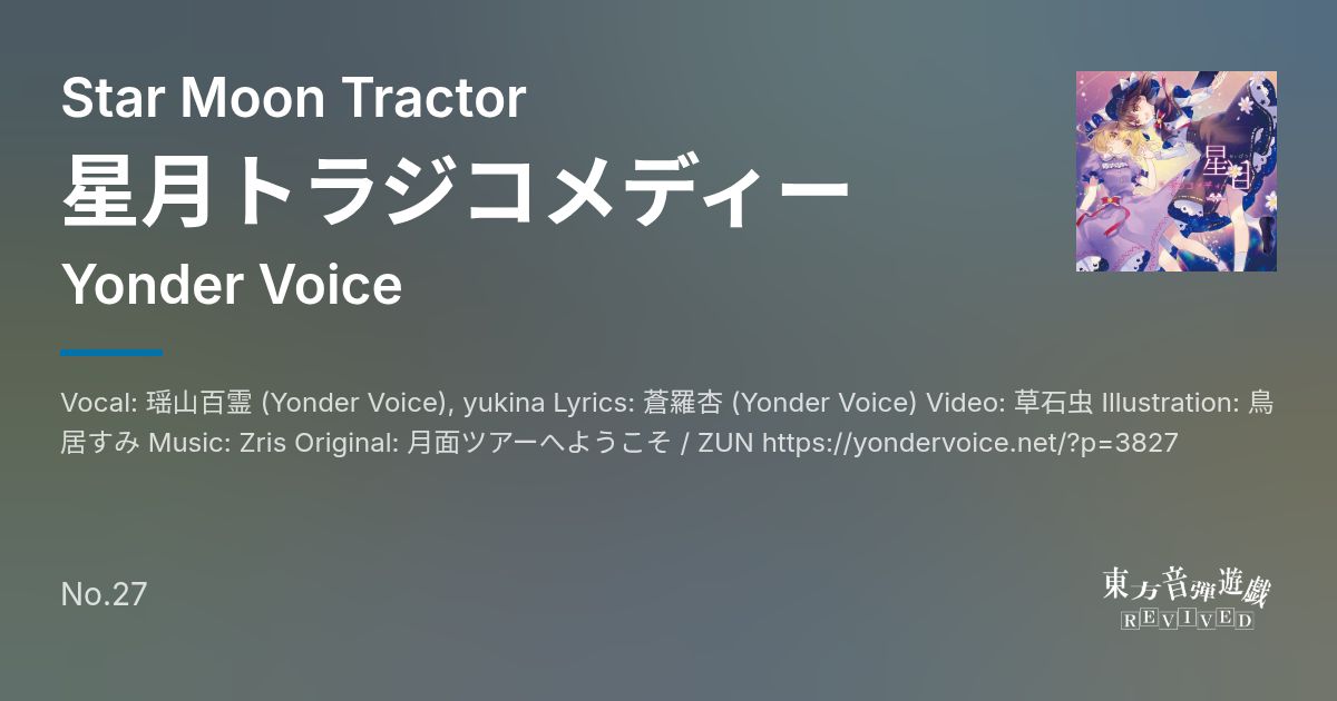 Artist: Yonder Voice Genre: Star Moon Tractor / Vocal: 瑶山百霊 (Yonder Voice), yukina Lyrics: 蒼羅杏 (Yonder Voice) Video: 草石虫 Illustration: 鳥居すみ Music: Zris Original: 月面ツアーへようこそ / ZUN https://yondervoice...